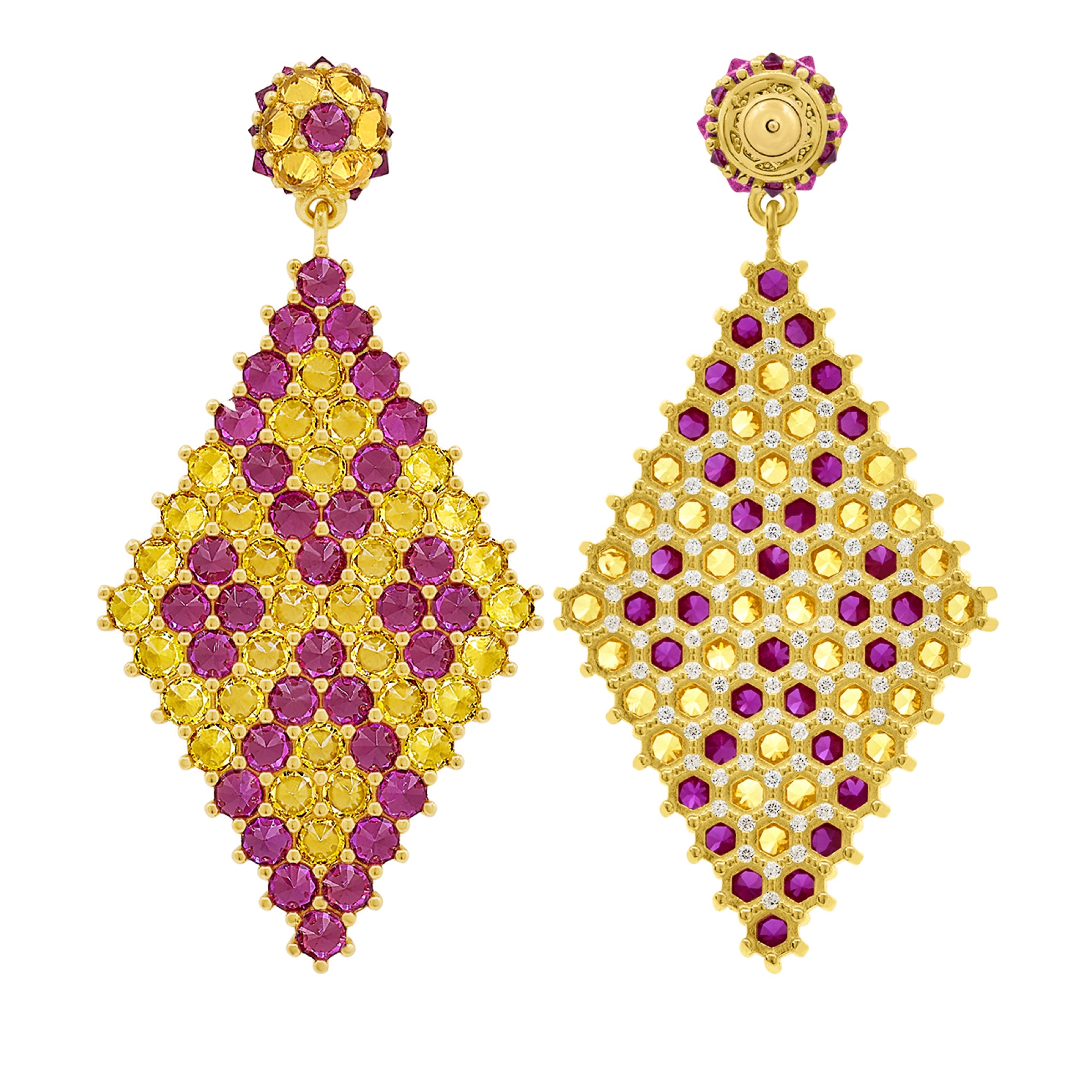 By placing my reverse-set stones on a flat plane, they dance with the slightest movement, and enchant the eye. But the greatest surprise was how the stones glow from the front and the back. Like a kaleidoscope or stained-glass, this design brings its own aura to your side.