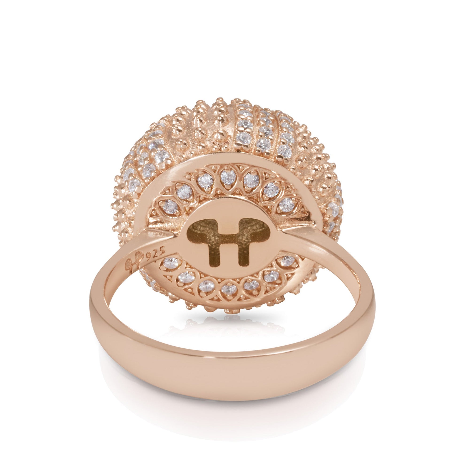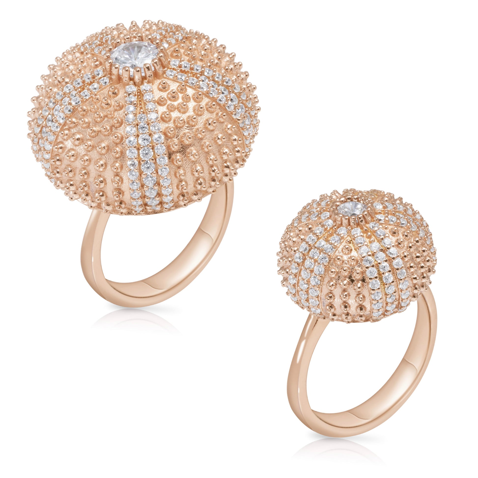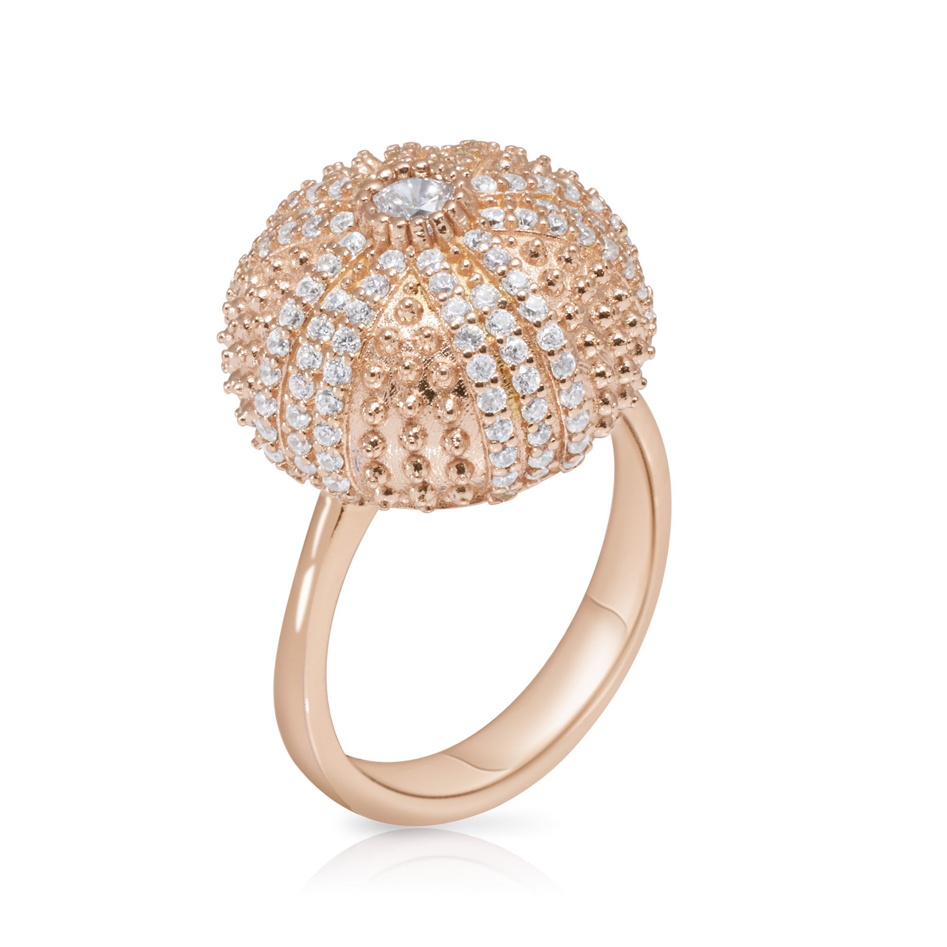 Even though the inspiration for this ring comes directly from nature, I tried to abstract the design to make it iconic. I think there is a tremendous amount of beauty that can be captured with just gold and stones, and even my friends who have never seen a sea urchin skeleton love this design.