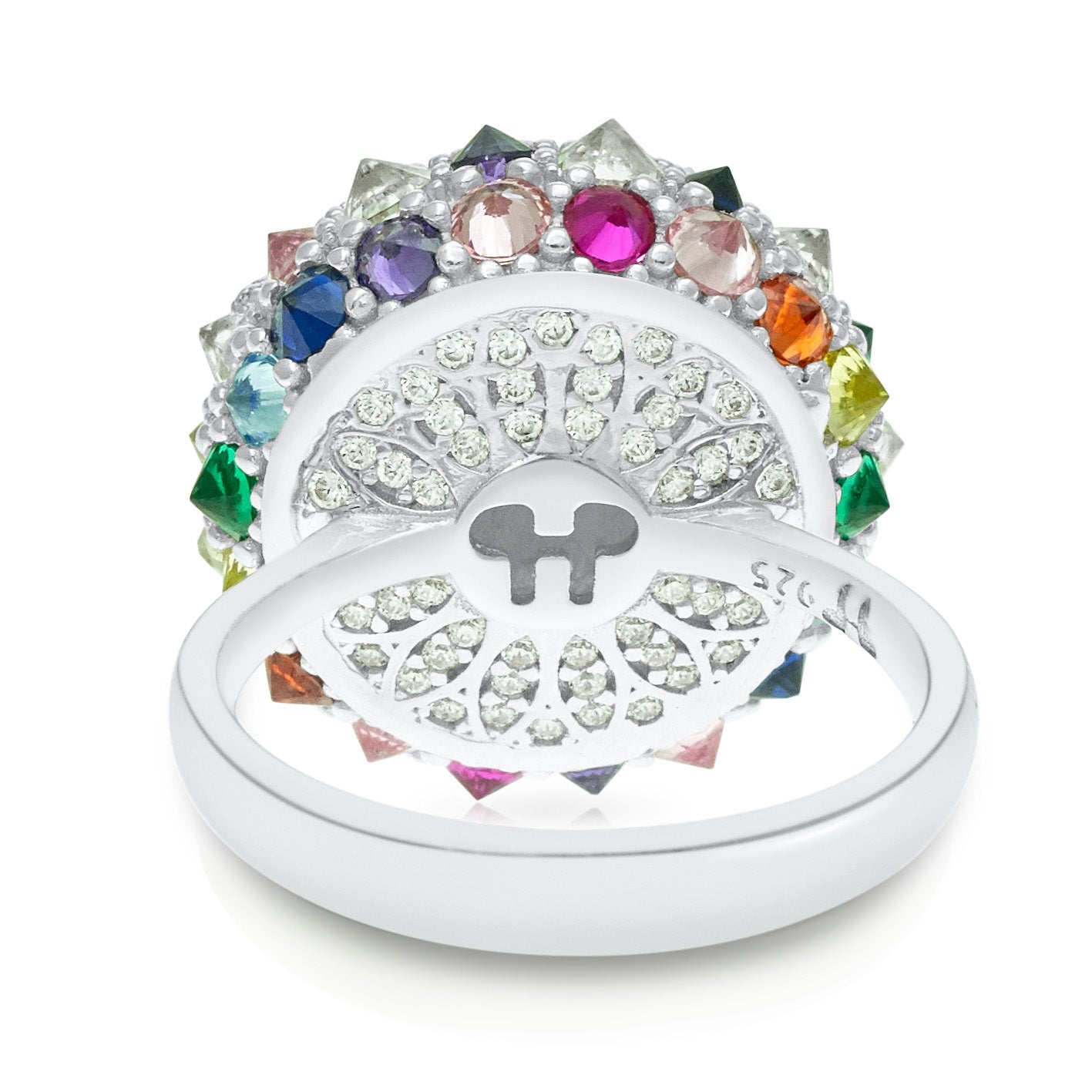 Since I wanted to capture the extreme beauty of a rainbow, I felt like I had to do something completely irreverent, so I reverse-set each stone. Then, to support the unfamiliar reflections of these typically hidden facets, I created a new geometry to reveal their brilliance on a woman’s hand and reflect a little rainbow magic.